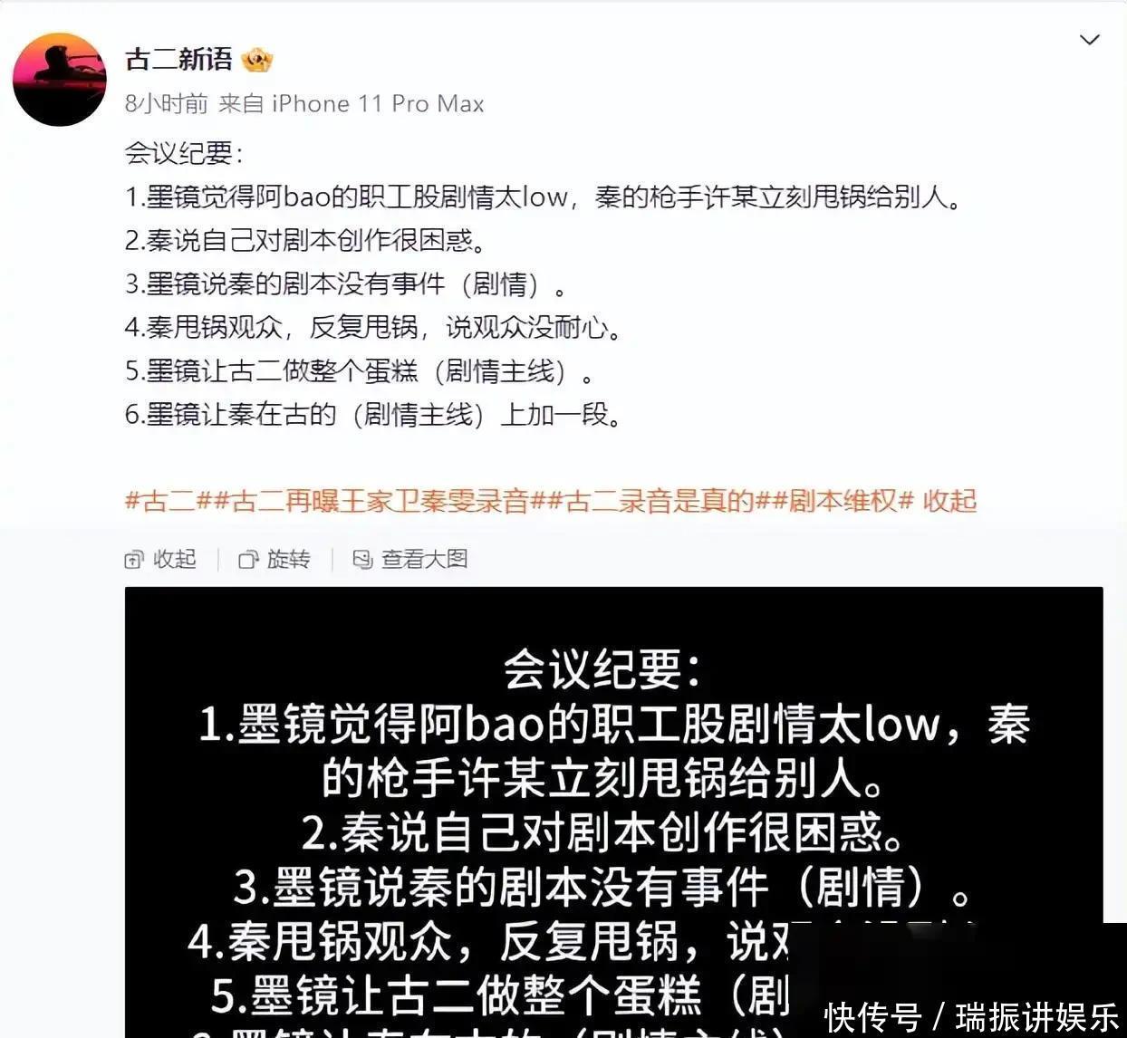 身体健康问题是古二的一个原因,还有一个原因就是她的背后有靠山。古二在11月14日发声,公开一段录音,证明自己是《繁花》这部戏的主要创作者。古二的维权行为,其实到这里也就结束了,因为她自曝的内容,已经证实了她的身份,就算以后再被横店打回原形,也不能否认她是编剧的事实。