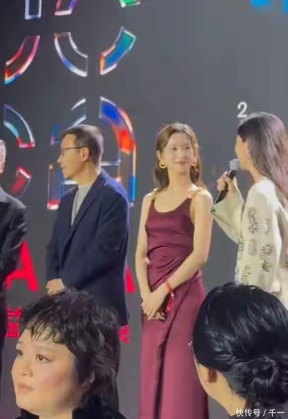 朱珠则选择米白色亮片西装外套搭配深紫色曳地长裙,西装的利落剪裁赋予力量感,亮片如星河洒落肩头,行走间流光暗转。内搭的丝绒长裙与外套形成深浅层次碰撞,垂坠面料勾勒出优美身形。标志性的蓬松长卷发自然披散,无需过多修饰便诠释出“岁月沉淀的松弛感”。这种“国泰民安”的大气雍容,与她艺术策展人的身份相得益彰。