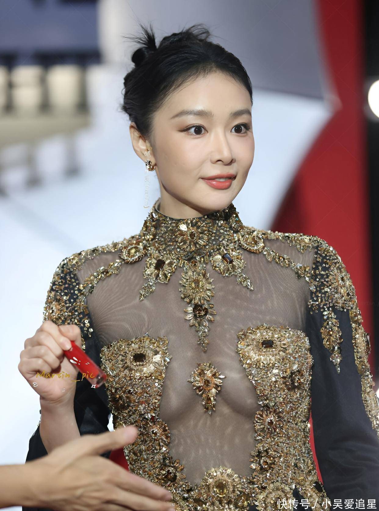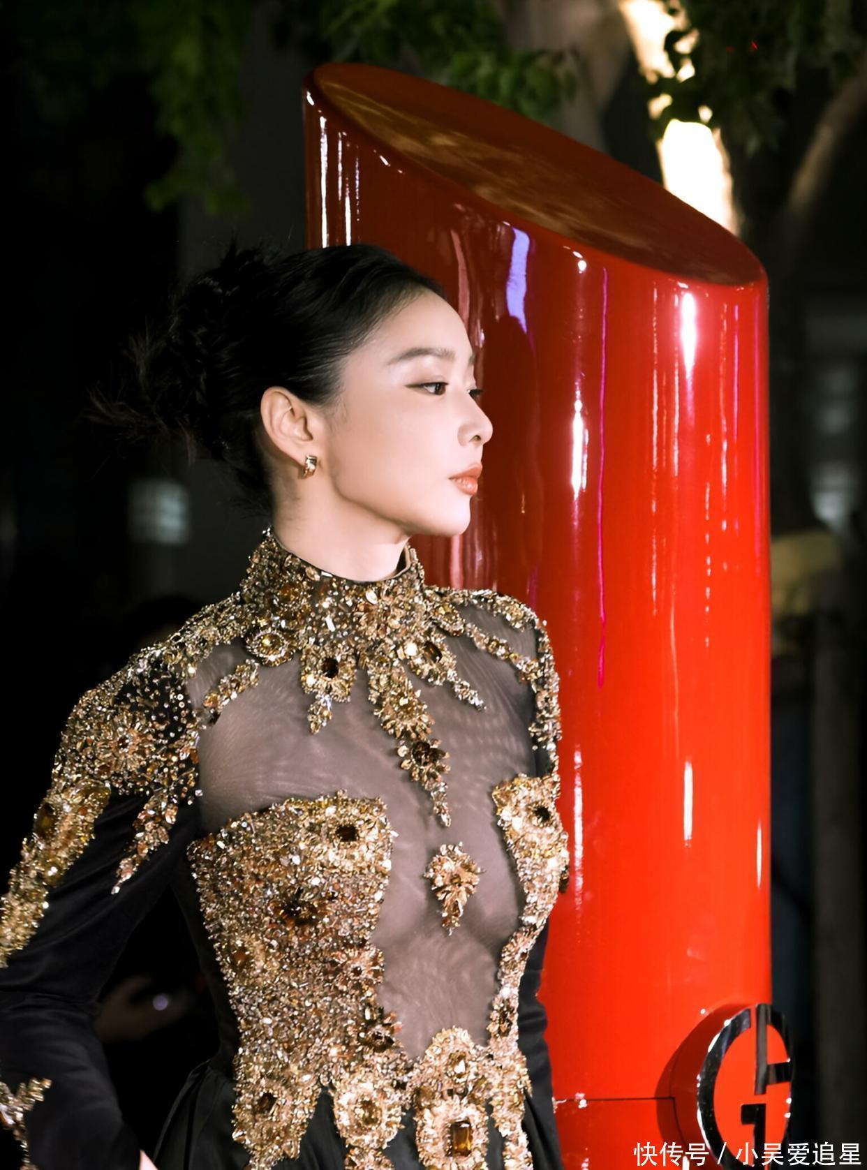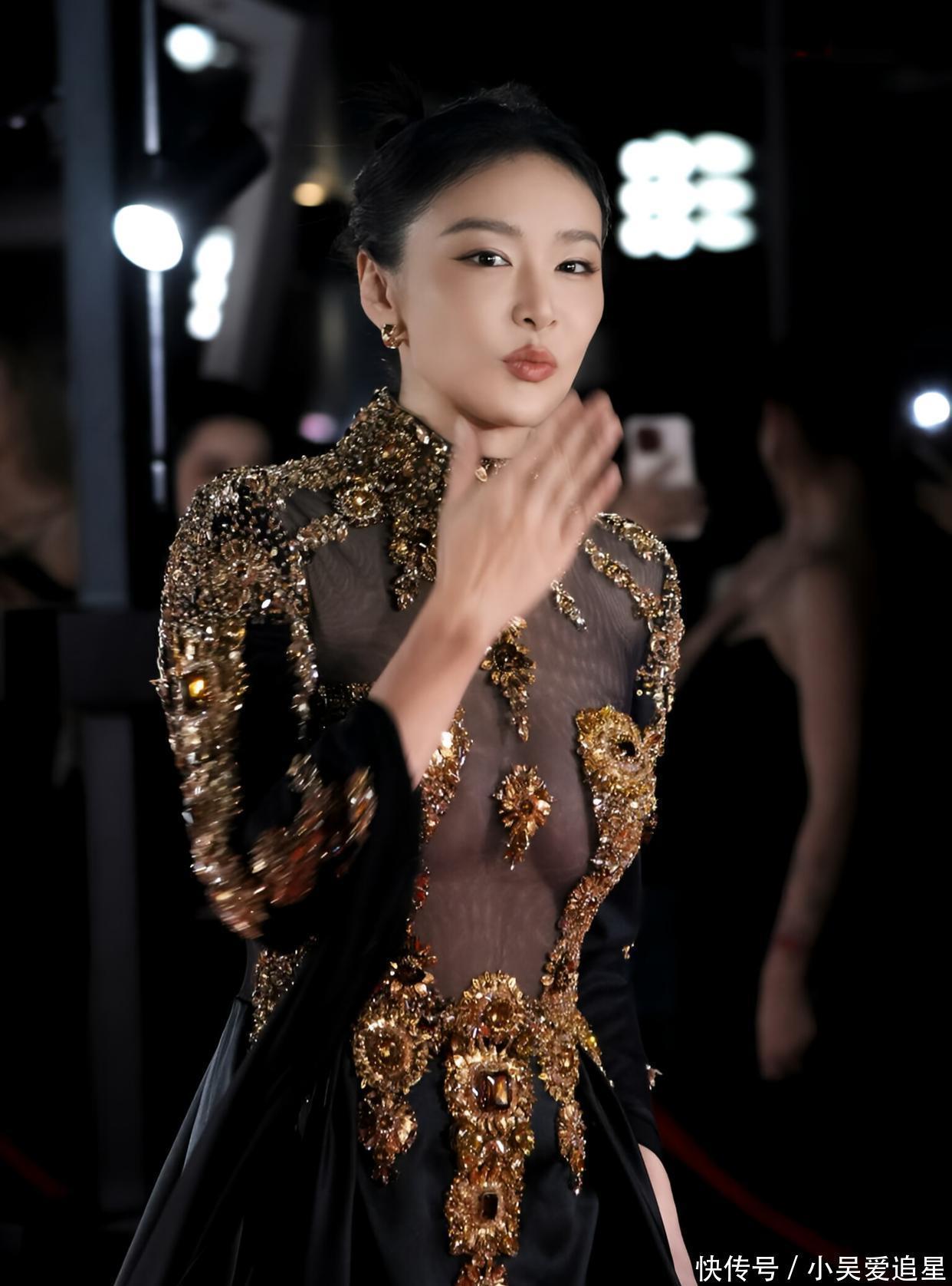 先瞧瞧她穿的那套阿玛尼,黑色的裙装,上面满是金色的刺绣和装饰,跟艺术品似的。领口和胸前的设计很特别,半透明的材质,把她的身材线条隐隐约约地透出来,性感又带着神秘。高叶的身材,那在娱乐圈也是数得着的,凹凸有致,穿这种考验身材的衣服,本来就很有优势。那为啥有人说没撑住呢?我琢磨着,可能是这衣服设计太前卫了,金色的装饰又多又密,视觉上有点满。但你仔细看,高叶的姿态,还有她自身的气场,完全把衣服的华丽感给 hold 住了。她往那儿一站,就跟女王似的,自信又大方,这哪是没撑住,明明是把衣服的格调都提升了。再说了,“大嫂” 的魅力,可不止是身材。她往红毯上那么一亮相,那眼神,那气场,直接就把人给抓住了。这身衣服虽然前卫,但高叶用自己的气质和身材,把它穿出了独一份的味道,我看啊,这造型绝对是成功的,那些说没撑住的,纯纯是鸡蛋里挑骨头。