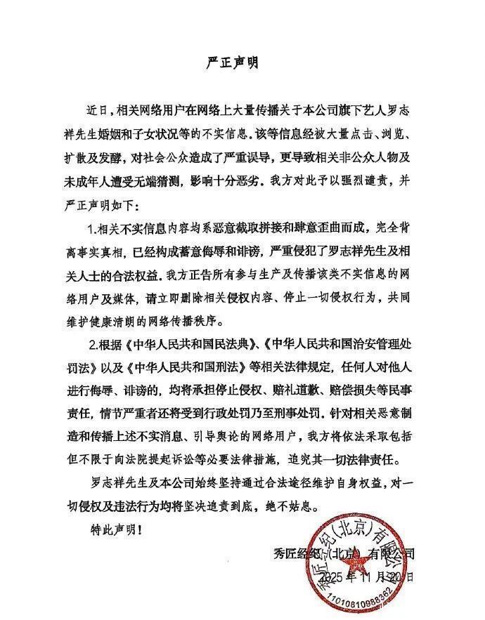 2025年11月26日中午,罗志祥经纪人小霜突然在社交平台发布长文,晒出两份亲子鉴定报告,直指连日来"罗志祥是其孩子生父"的网络传言纯属谣言。报告显示,经过台湾慧智基因医学实验室20组STR基因比对,罗志祥与小霜的一双儿女米果、米堡存在8组基因型不符,亲子关系概率为0%,排除率高达99.99%。