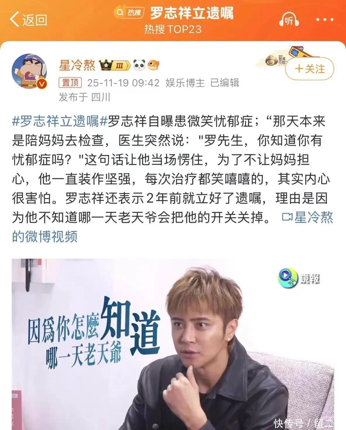 今年11月,罗志祥借新书宣传密集曝光私人生活:自曝陪母亲检查阿尔茨海默症时确诊微笑抑郁症,两年前已立好遗嘱,将小霜子女列为继承人。这些"卖惨"操作引发争议,有网友嘲讽:"从时间管理大师到悲情老爹,剧本写得比《海派甜心》还狗血。"